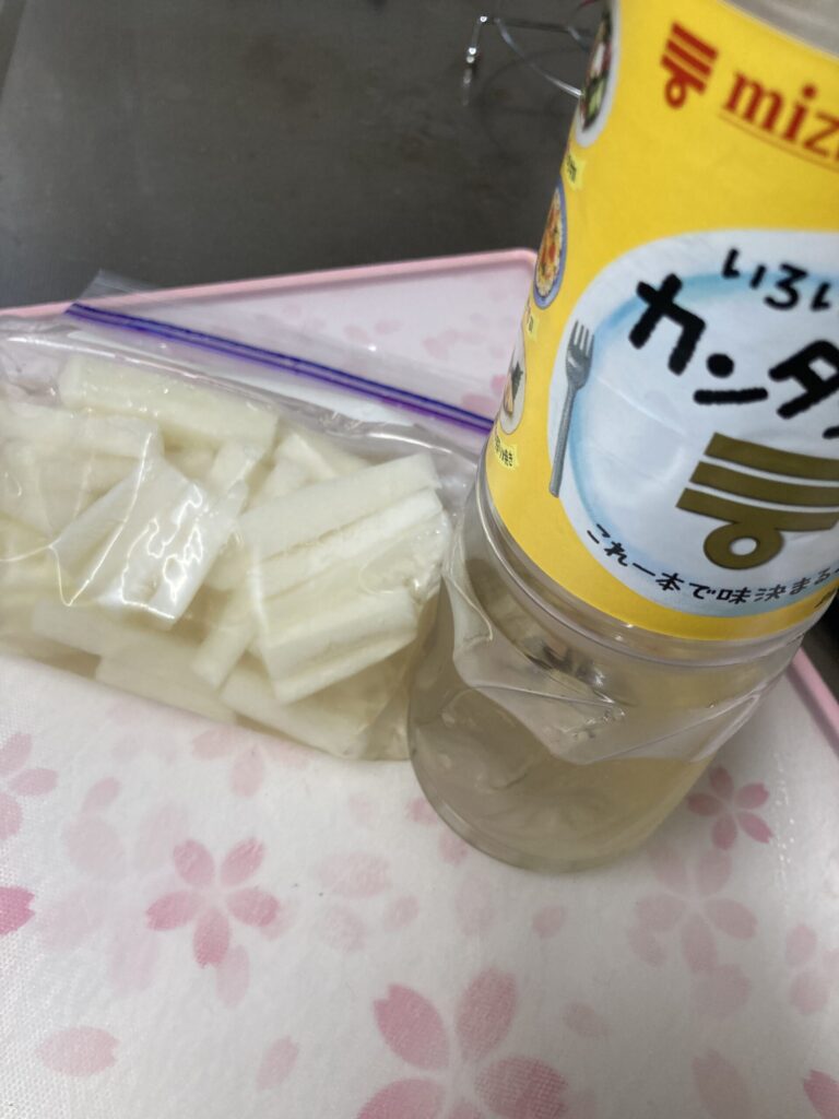 ストック袋に入れて、ミ〇カンさんの「カン〇ン酢」を注いで冷蔵庫へ。