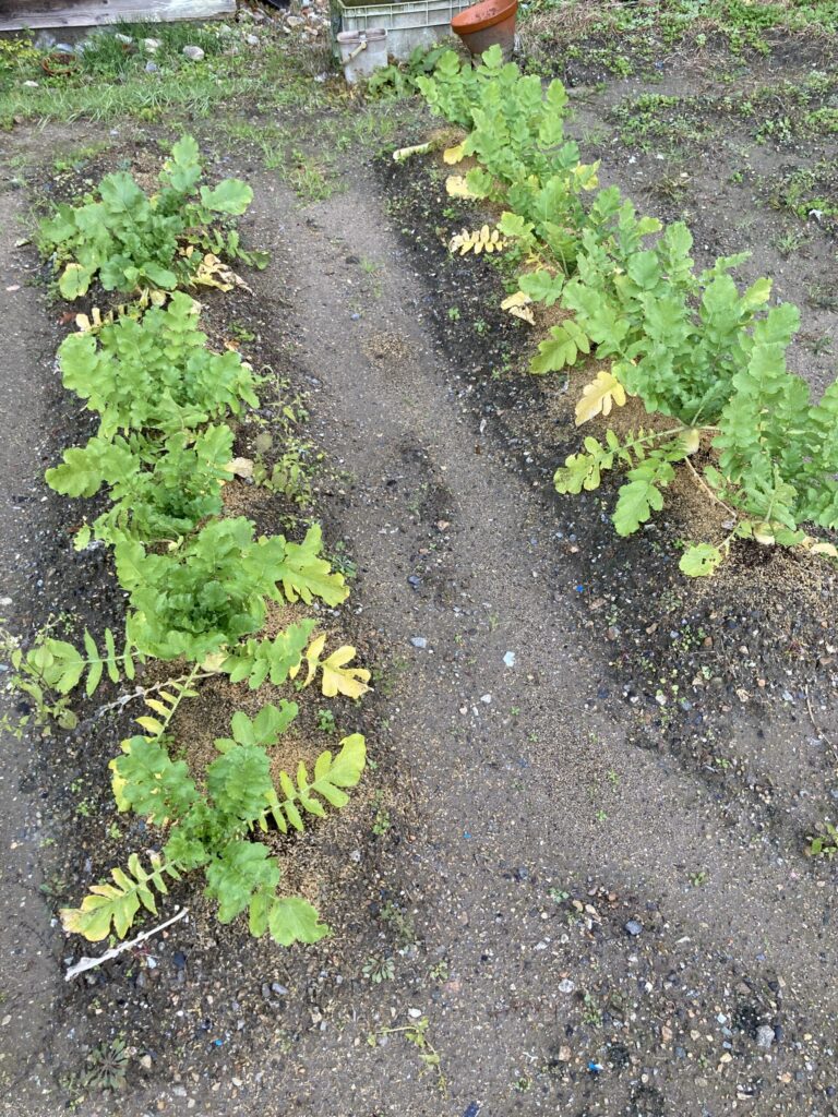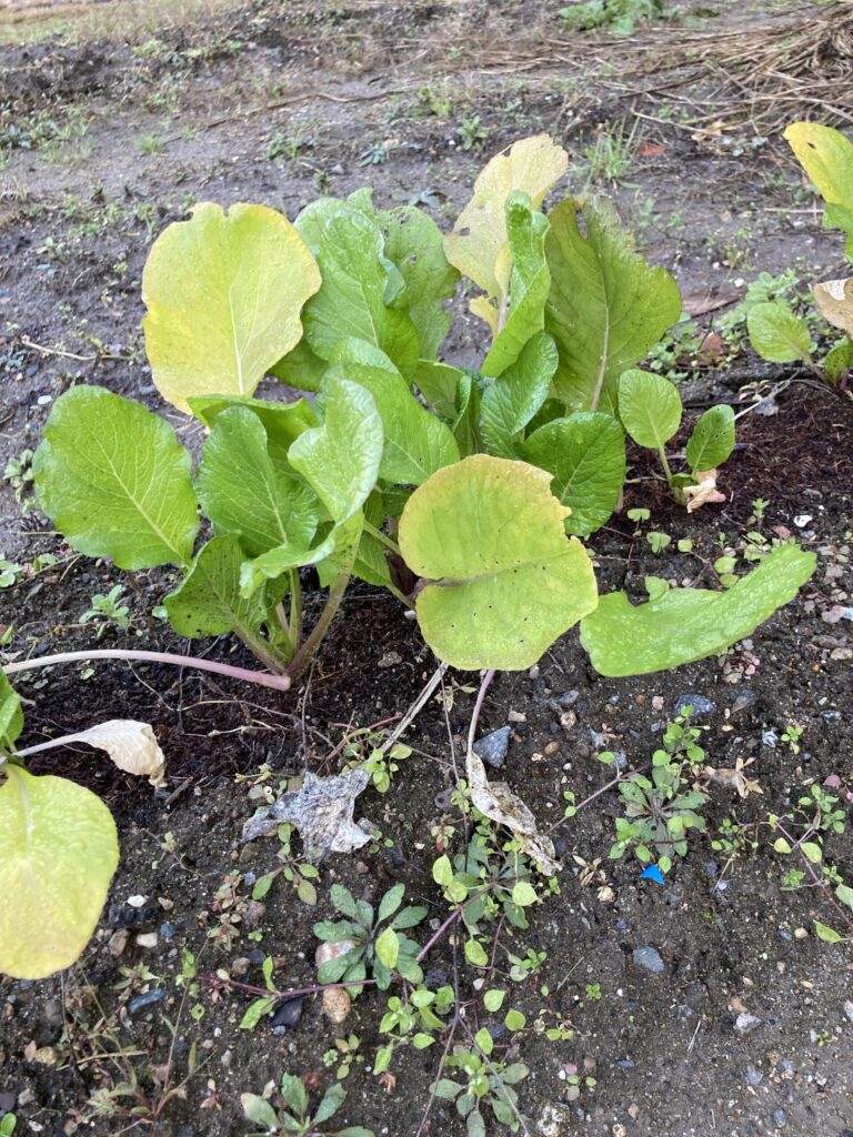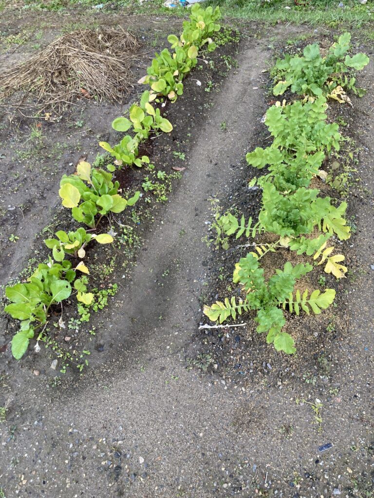 【左:すっかり食べごろの小松菜  右:6㎝ほどに太ったダイコン】
