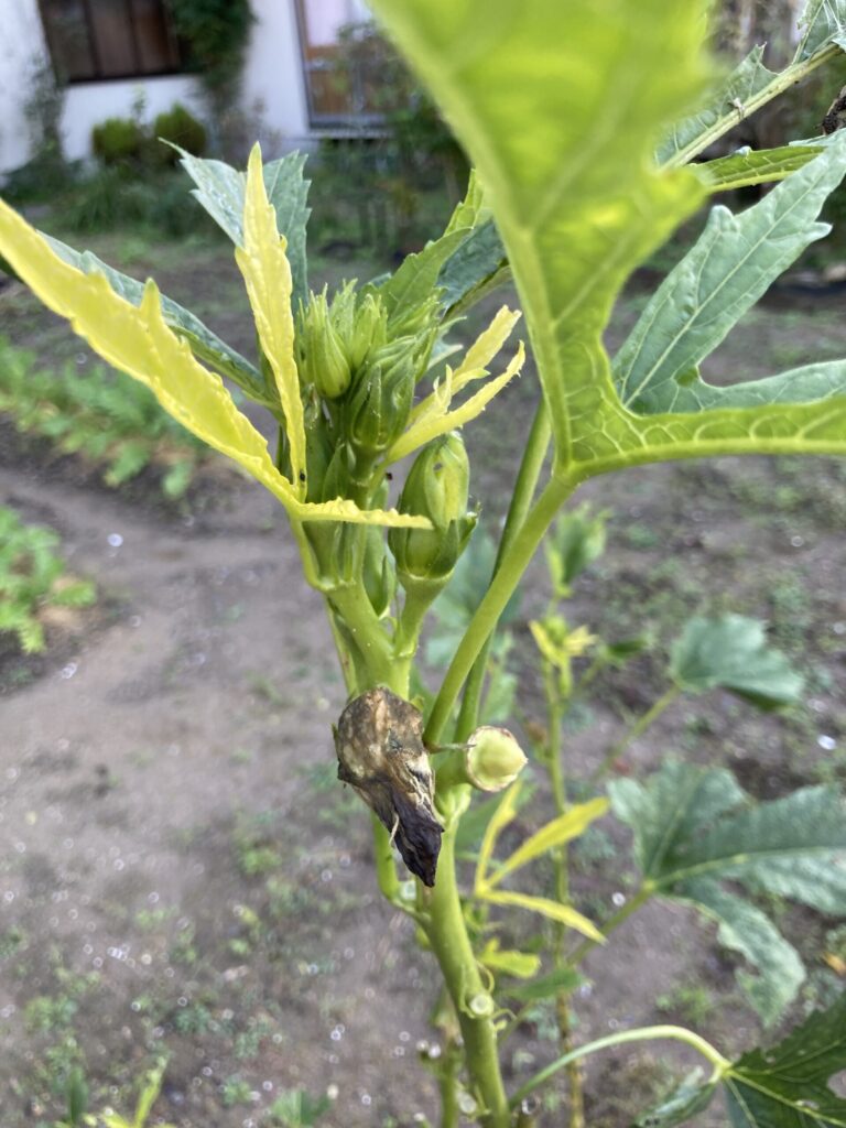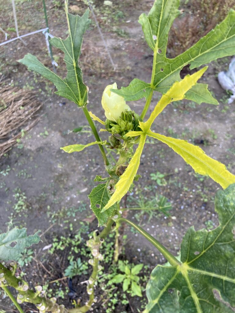 オクラです。花は咲いていますが、実はなりそうにありません。来週には、大葉とともに撤去の予定です。