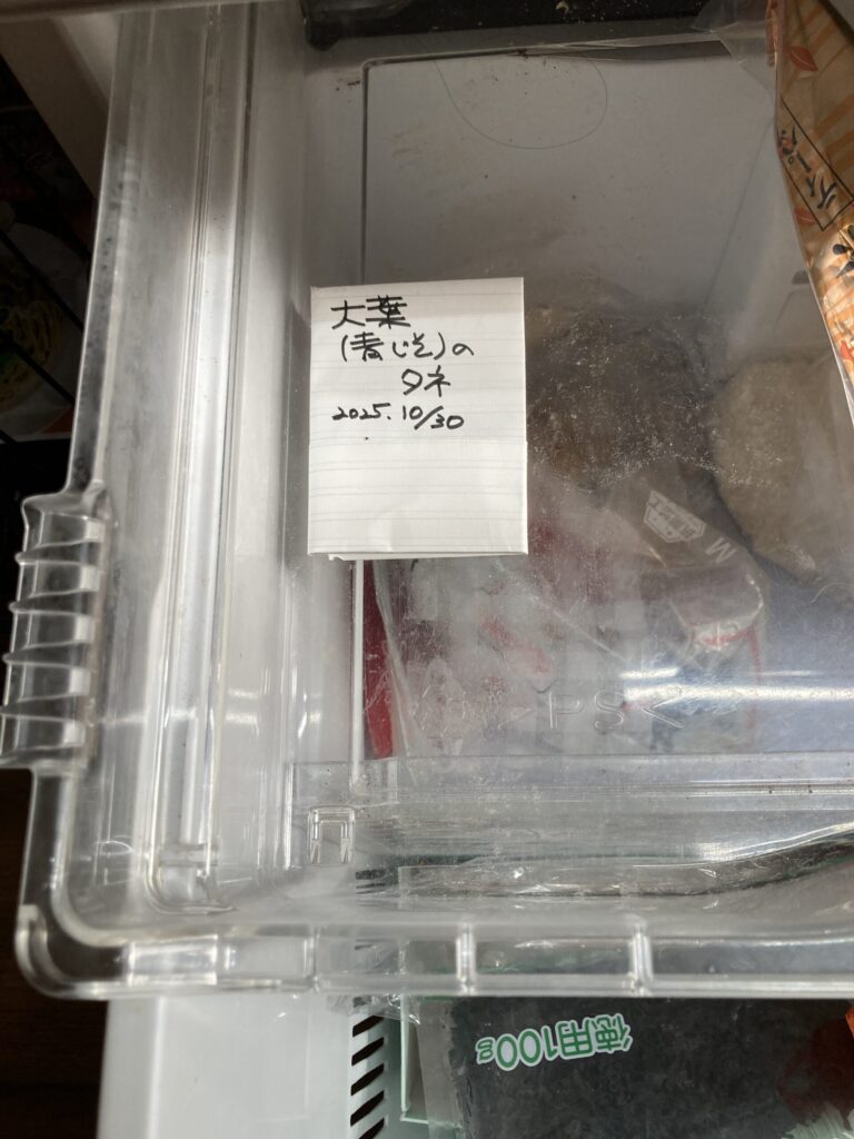 ④ コレを、家にあったルーズリーフで作った袋に入れて、冷蔵庫へ。冷暗所保存です。