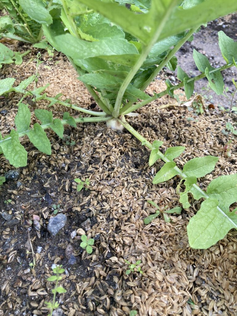 ダイコンはチラリと太くなってきた根の部分が見えます。小松菜ももう少しで収穫できそう?です。